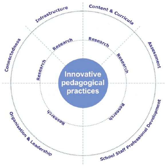 Por último, o framework da comunidade europeia que também envolve uma visão multidimensional concretizada em 7 dimensões com recomendações para a elaboração de políticas envolvendo conteúdos e currículos, avaliação, desenvolvimento de professores, organização e liderança, conectividade e infraestrutura.